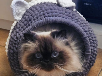 Panière réalisée par Marie-Jo pour son chat ShimSham.Après quelques hésitations, il l’a adoptée.