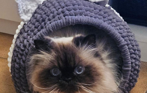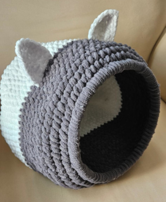 Panière 11 mars 2026 Viviane Copines, Les créations de Marie-Jo 2 Panière réalisée par Marie-Jo pour son chat ShimSham.Après quelques hésitations, il l’a adoptée.