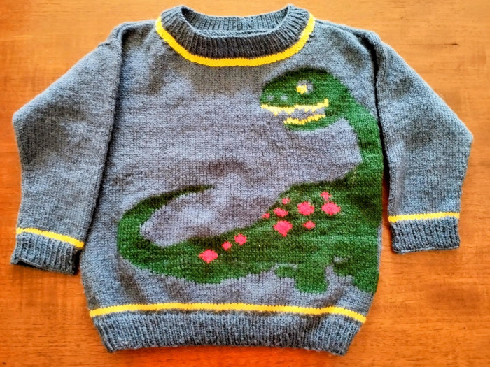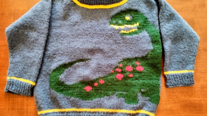 Pull dinosaure 31 janvier 2026 Viviane Copines, Les créations de Mireille 1 Fan de dinosaure, Eliot est gâté par sa mamie Mireille